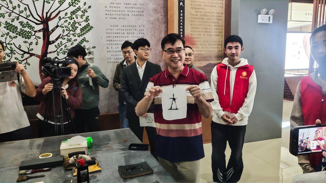 体验甲骨文拓印。“甲骨文体操采用年轻化的传播形式,让两岸同胞直观感受甲骨文的象形之美和文化内涵,加深了他们对文化同根同源的认知,增强了他们对中华文化的认同感和归属感。”甲骨文广播体台湾青年郑女士表示:“以前,甲骨文在书上,我们没有机会走近它。今天,甲骨文离我们很近。”